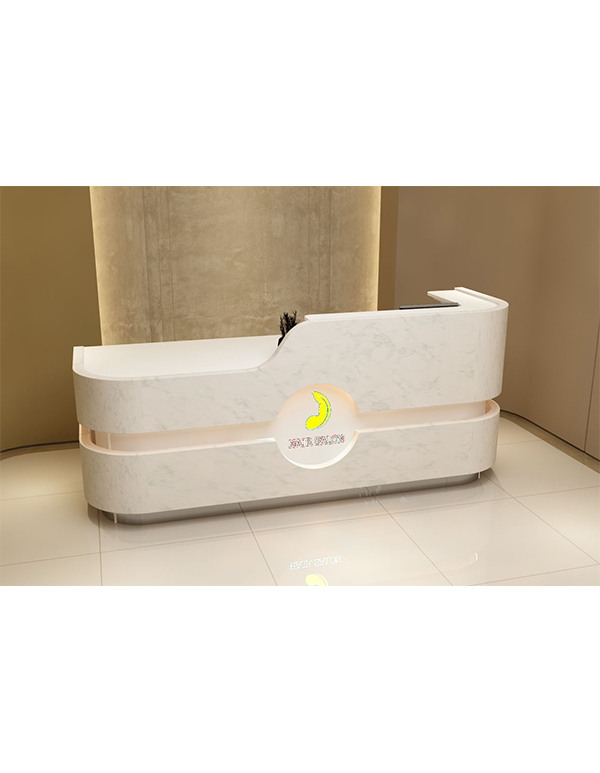 Dubai Banko’nun ön yüzeyi, mermer dokusunu andıran parlak beyaz kaplamasıyla ferah ve aydınlık bir görünüm kazandırır. Pürüzsüz yüzeyi ışığı yansıtarak mekânı daha geniş ve davetkâr hale getirirken, yatay formda kullanılan ışıklandırma detayı tasarıma modern bir dinamizm katar. Ön panelde yer alan dairesel detay, bankoya karakteristik bir kimlik kazandırırken, aynı zamanda kurum logosu veya marka ismi için estetik bir alan oluşturur.