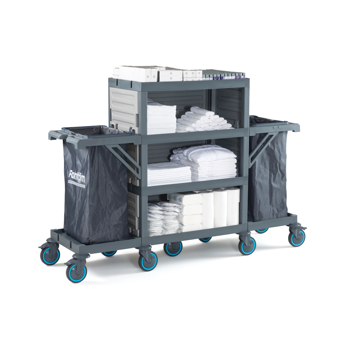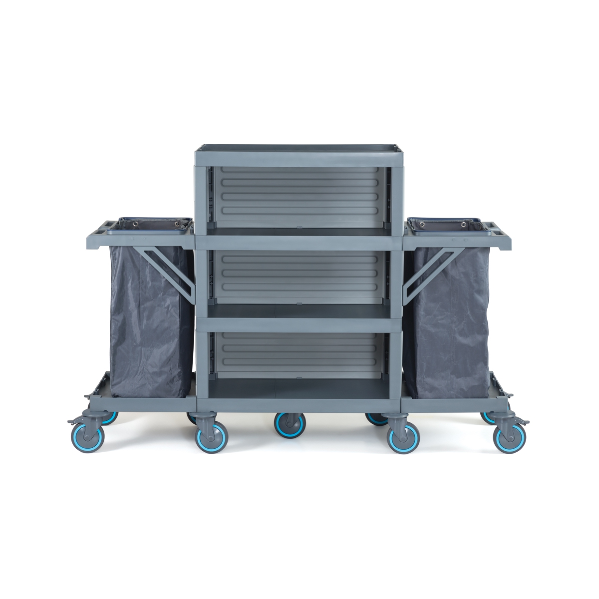 Procart 430 Kat Arabası, 450 kg taşıma kapasitesi ile otel, hastane, yurt ve tatil köylerinde verimli kat hizmetleri sağlar. Plastik gövdesi, su ve kimyasal temizliklerden etkilenmez ve paslanmaz. 2 x 120 lt çamaşır toplama kapasitesine sahip olan bu model, üç katlı yapısı ve dört rafıyla daha fazla taşıma imkanı sunar. 6 mm kalınlığında CPP malzeme ile üretilmiştir, sağlam ve dayanıklıdır. 4 adet frenli ve 4 adet frensiz tekerleği, kolay hareket edebilmesini sağlar, ayrıca eğik yüzeylerde sabitleme imkanı sunar. Modülün estetik tasarımı, ön tarafının açık, diğer üç tarafının kapalı olmasıyla şıklık katmaktadır. İki taraftan sabitlenmiş itme sapları ve çöp torba kilitleri ile kullanım rahatlığı sağlar. Ürün, kurulu olarak adresinize teslim edilir.